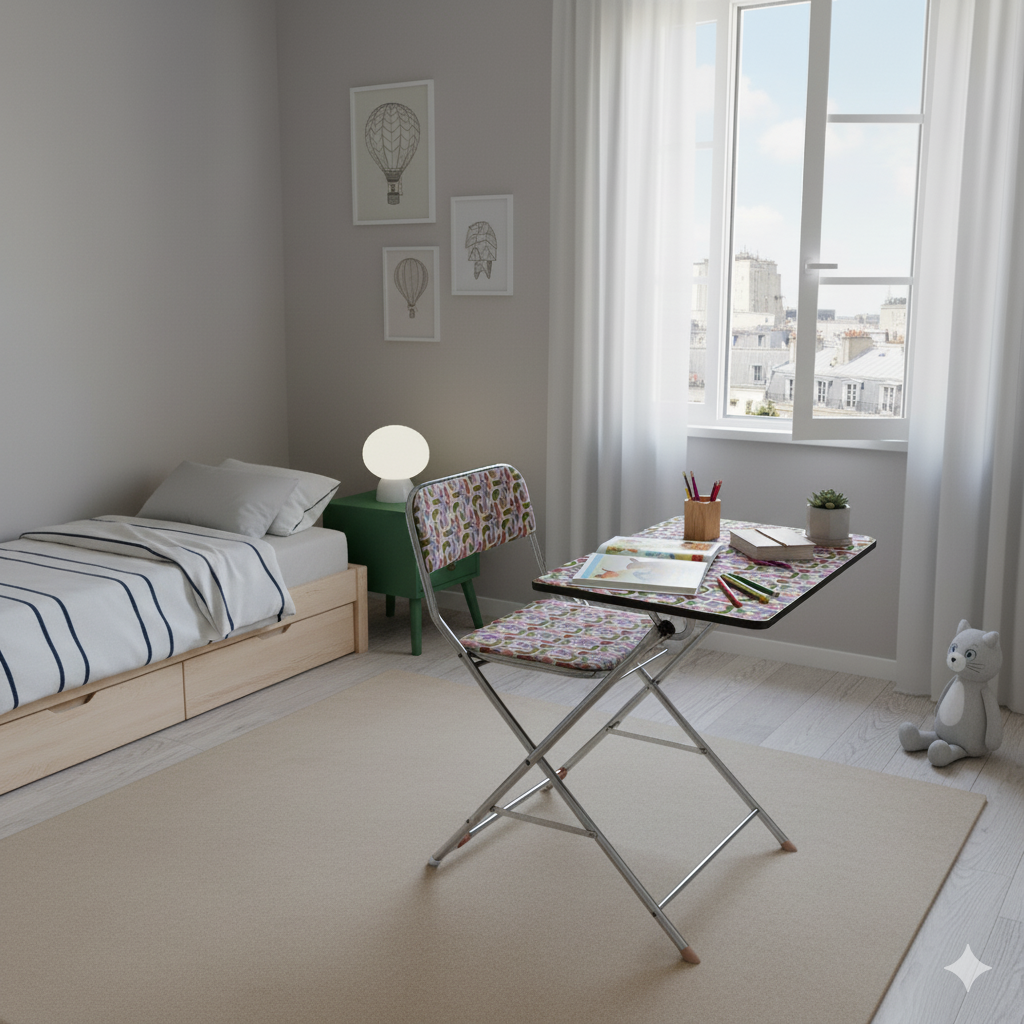 Banc d’école pliant avec structure tubulaire chromée, plateau en formica, siège en cuir de skaï. Projet de rénovation en toile enduite dans le plus pur style des années 1970.